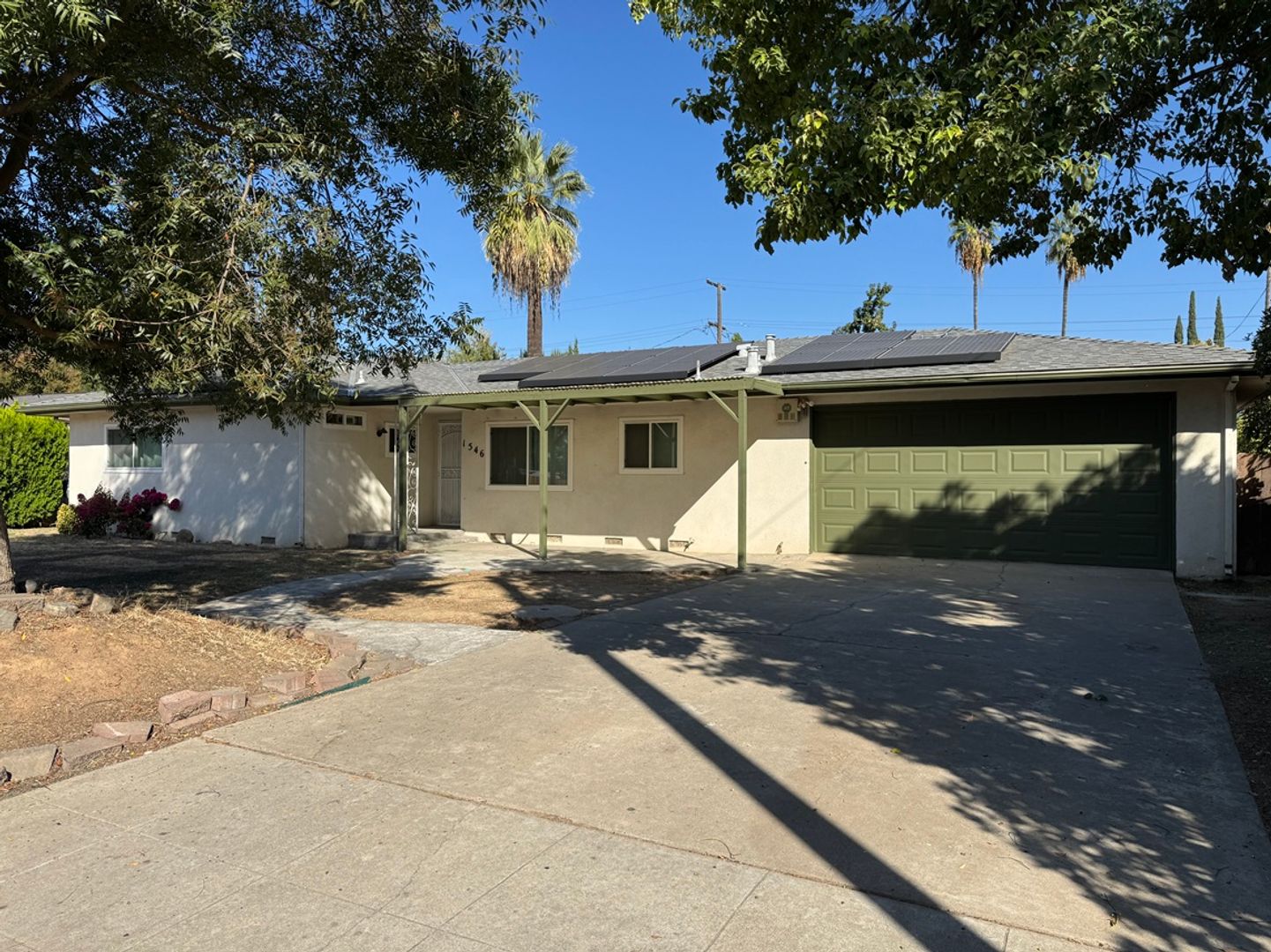 Welcome to this charming single-level home. This property boasts three bedrooms and two full bathrooms, perfect for comfortable living. The home is equipped with solar panels, promoting energy efficiency and sustainability. The cozy kitchen and dining area provide a warm and inviting space for meal preparation and dining. The great room and den/office offer ample space for relaxation and work. Step outside to the large backyard, complete with a swimming pool and an enclosed patio, ideal for outdoor entertainment. The two-car garage provides plenty of space for parking and storage. This home is conveniently located near Fresno State, making it an excellent choice for those seeking a blend of comfort and convenience.