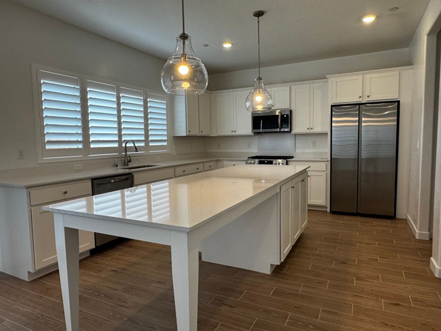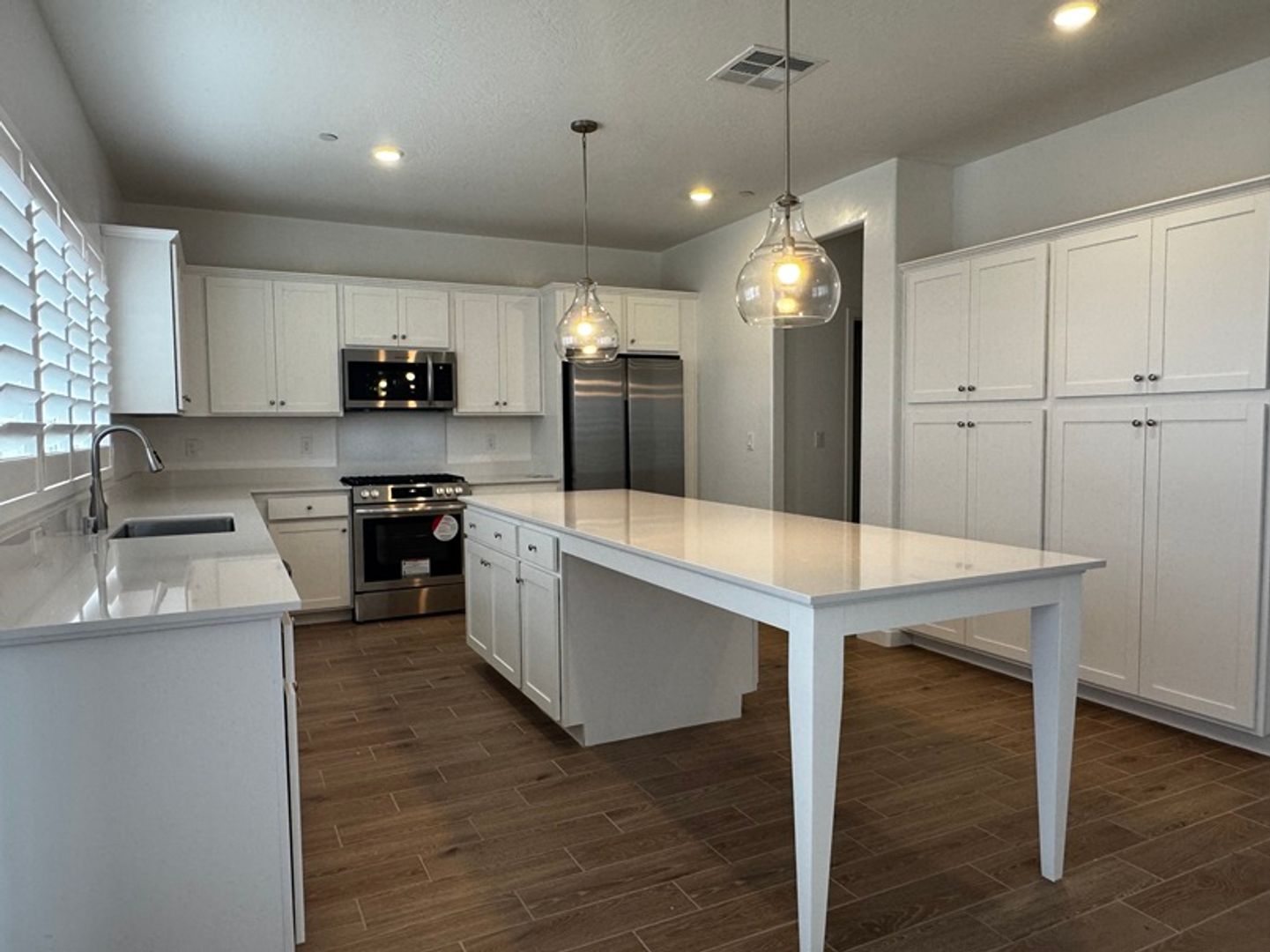 Expansive Kitchen: Abundant cabinets, gas range, modern stainless steel appliances. ( Refrigerator In Progress )